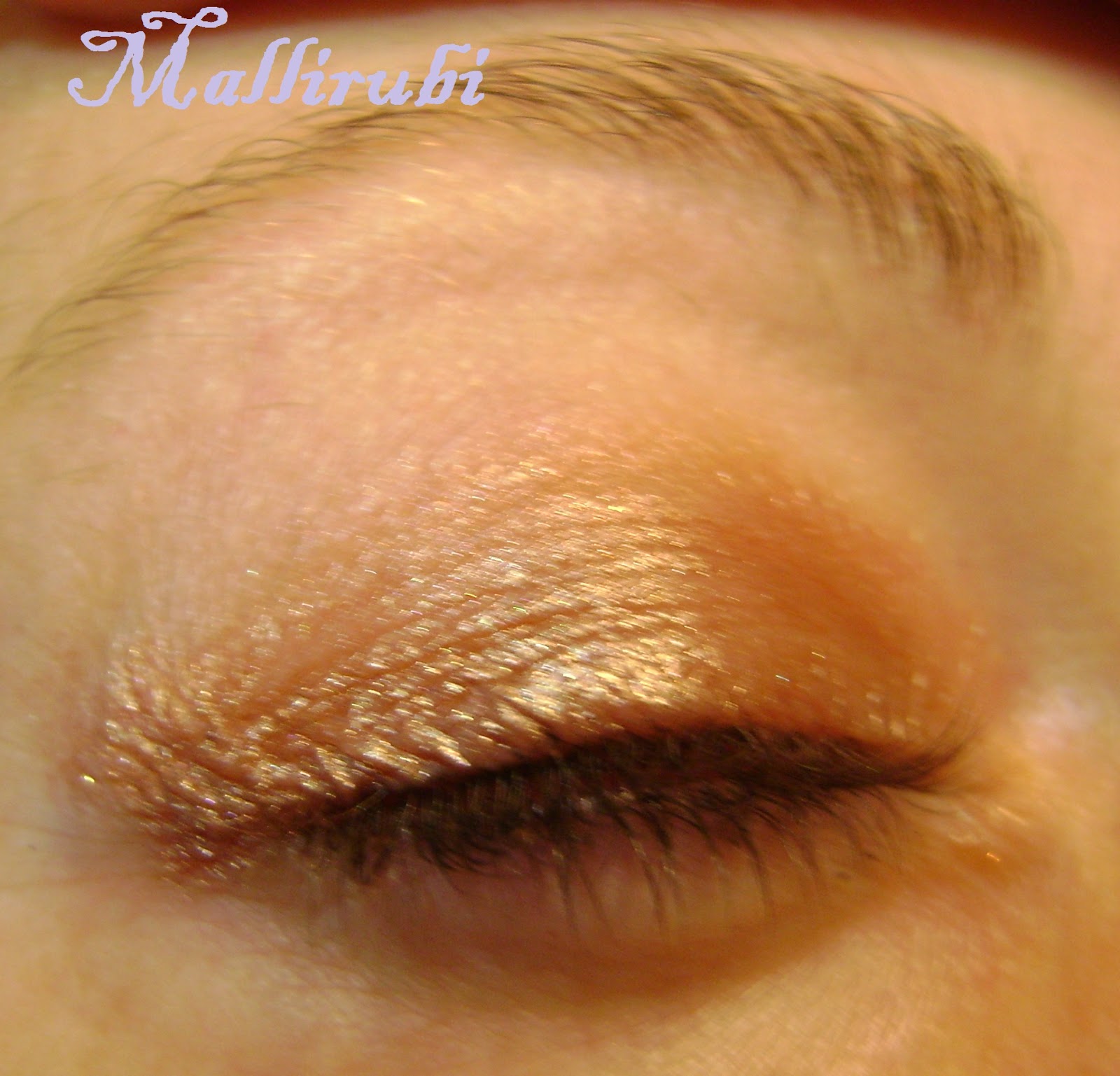 Y ahora paso a enseñaros las sombras. Son water proof, y doy plena fe de ello, ya que para retirármelas he tenido que utilizar un bifásico, concretamente el de Kiko. Y tienen una textura muy cremosa. Se trabajan bastante bien, y con muy poco producto cunde muchisimo. Os iba a hacer unos swatches, pero he pensado que lo véis mejor si me lo aplico en el párpado. Eso sí, que conste que solo lo he aplicado para que veáis el tono, no es un look completo y por favor...¡no seáis muy duras con el estado de mis cejas!!!! Gracias :),